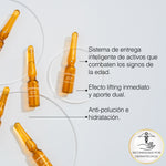 Rejuvenecedor antiedad con efecto tensor inmediato, hidratación y antipolución. Sistema de entrega inteligente de activos que combaten los signos de la edad. Efecto lifting inmediato y aporte dual anti-polución e hidratación.