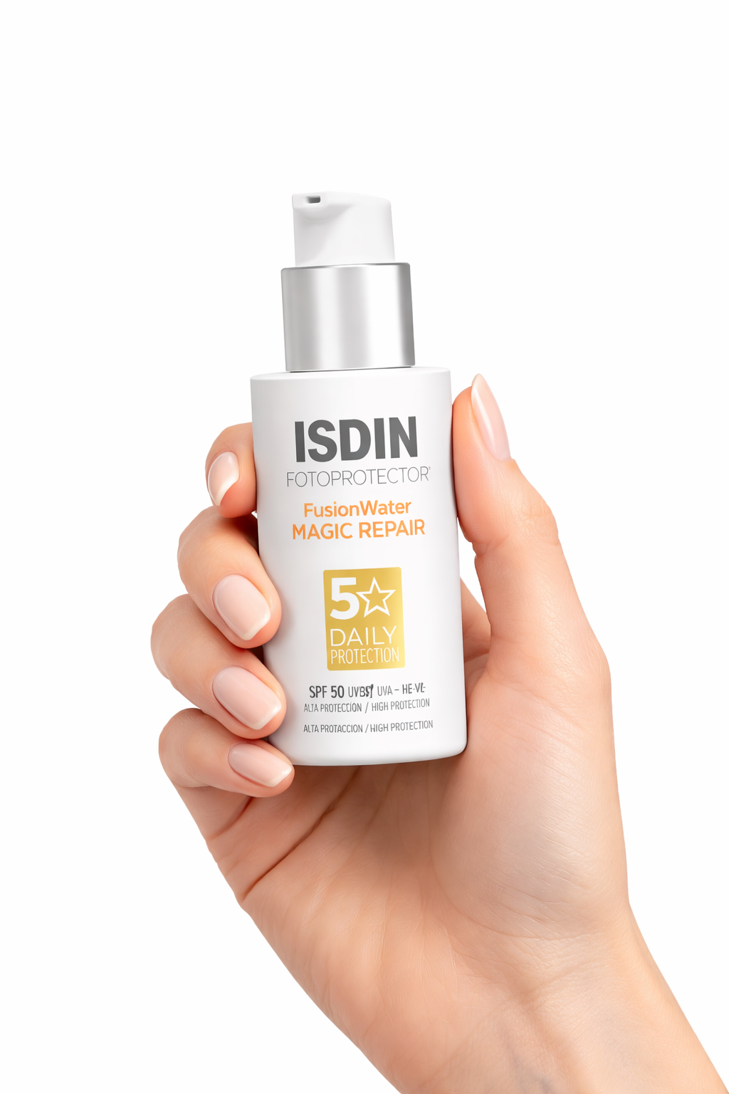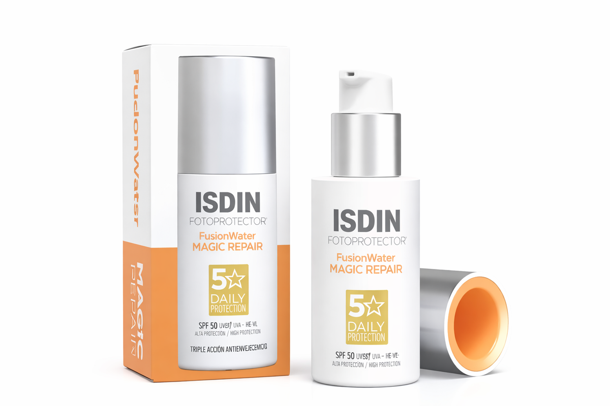 ISDIN Fusion Water MAGIC Repair SPF 50 es un fotoprotector facial de uso diario que protege la piel frente a la radiación UVA y UVB, mientras ayuda a reparar el daño solar y prevenir el fotoenvejecimiento. Su textura ultraligera a base de agua se absorbe de inmediato, dejando un acabado invisible y confortable.